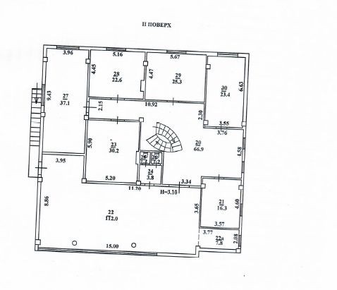 Будівля має підвальне приміщення, перший та другий поверхи. Загальна площа об’єкта становить 977 м².