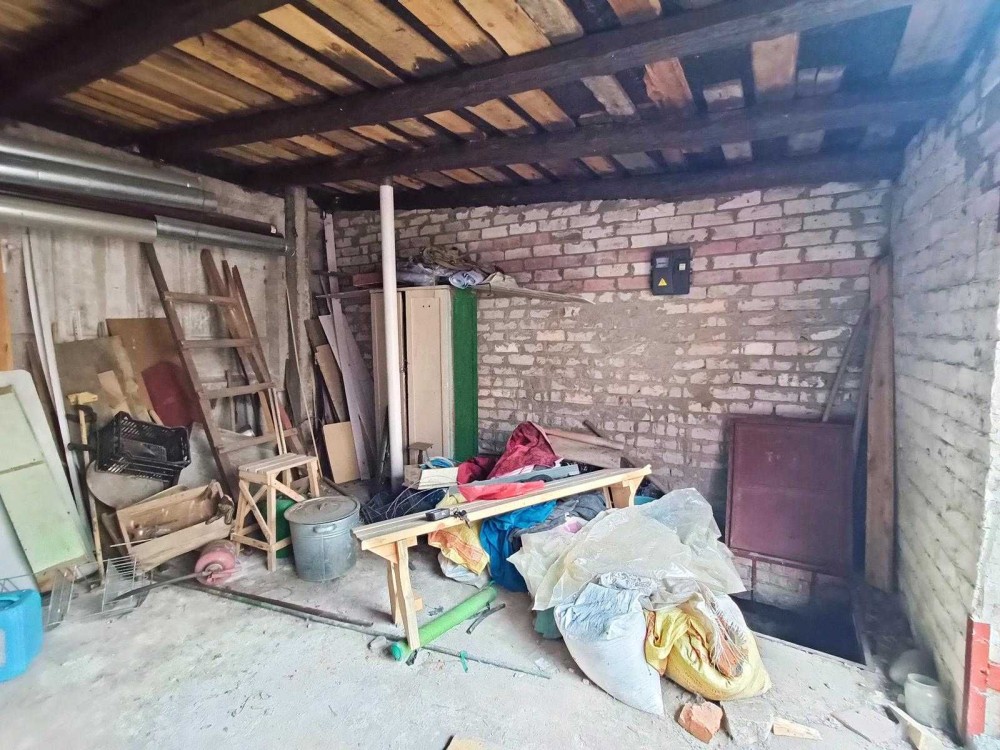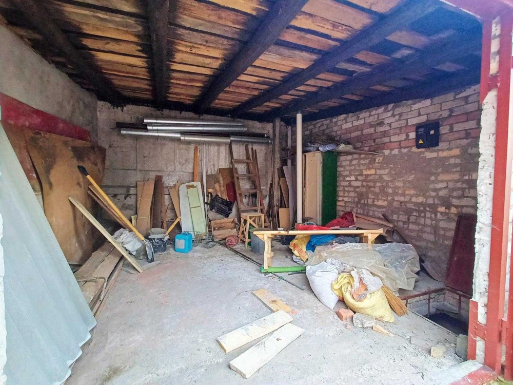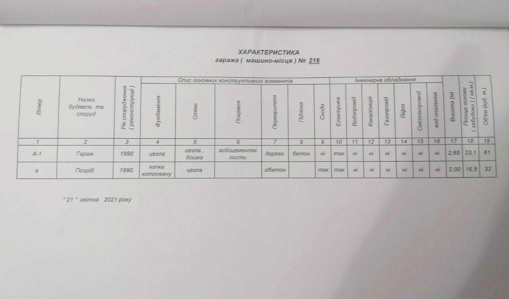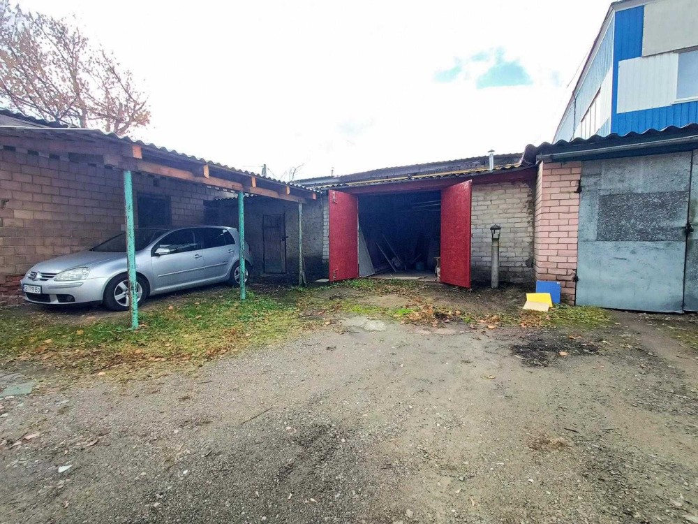 Бетонована підлога, стіни цегла, перекриття покрівлі дерево, покрівля - асбоцементні листи, поверх металопрофіль, металеві ворота. Потребує закінчення внутрішніх робот. Довжина гаража 4.67 м, висота 2.65, висота воріт дозволяє вільно заїзжати Рено Кенга, погріб практично на весь гараж з міцним товстим перекриттям. Є лічильник електроенергії. Гараж приватизований, з документами. Заїзд у двір постійно на замку.