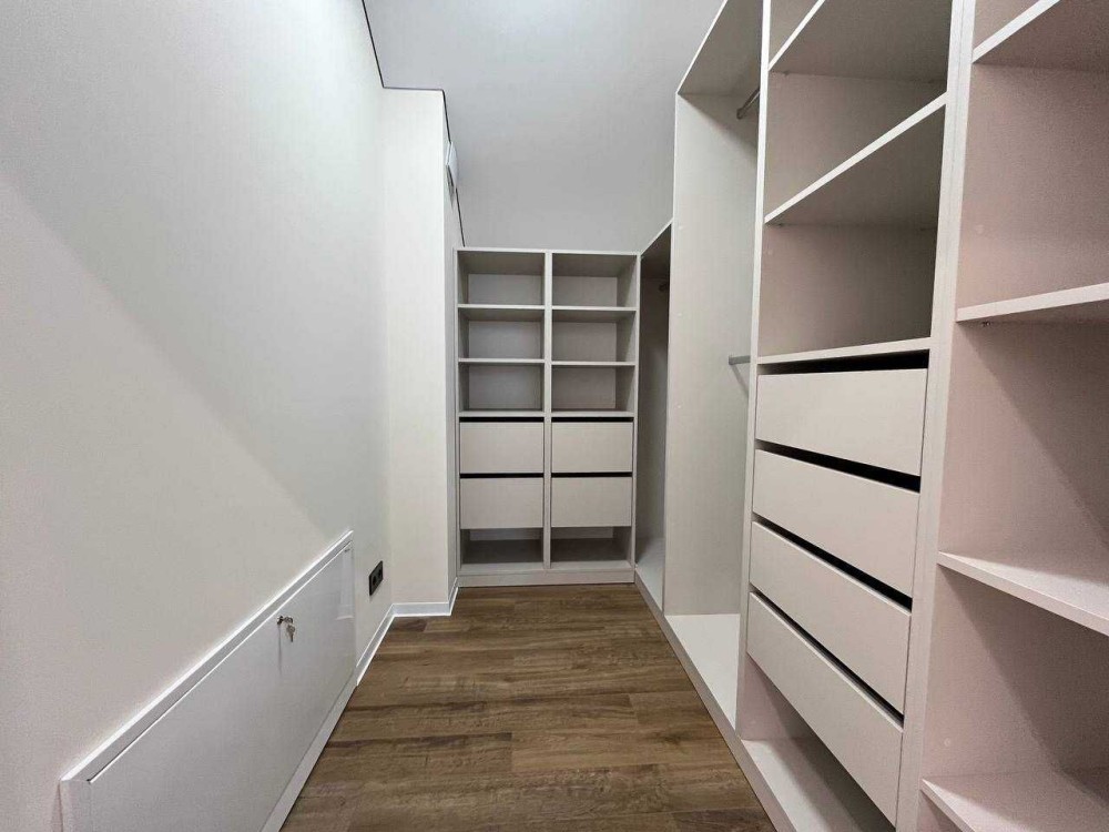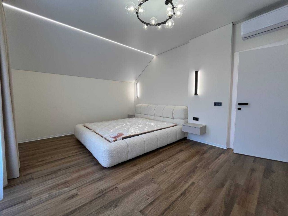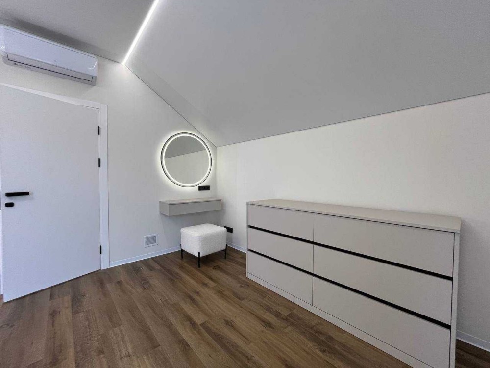 Інтер’єр будинку продуманий до дрібниць. У вітальні — розкішний кутовий диван світлого відтінку, який запрошує до відпочинку. У спальнях — широкі ліжка з м’якими узголів’ями, тумби, туалетний столик із дзеркалом та підсвіткою. Вбудовані гардеробні системи з відкритими полицями та висувними ящиками, а також стильні шафи-купе з якісною фурнітурою забезпечують максимальну зручність. Санвузли облаштовані сучасними меблями з вмонтованими умивальниками та дзеркалами з підсвіткою.