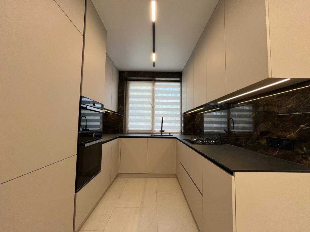 Кухня обладнана за останнім словом техніки: вбудована техніка Whirlpool (духова шафа, мікрохвильова піч, посудомийна машина), газова варильна поверхня, прихована витяжка, а також елегантна чорна мийка та змішувач преміум-класу. У будинку встановлені пральна та сушильна машини Samsung (вертикальне розташування для економії простору). Клімат-контроль забезпечують кондиціонери в кожній ключовій зоні — у вітальні та спальнях. Освітлення — це справжня гордість будинку: енергоощадні LED-системи, стильні світильники із прихованою підсвіткою та дизайнерські люстри створюють унікальну атмосферу.