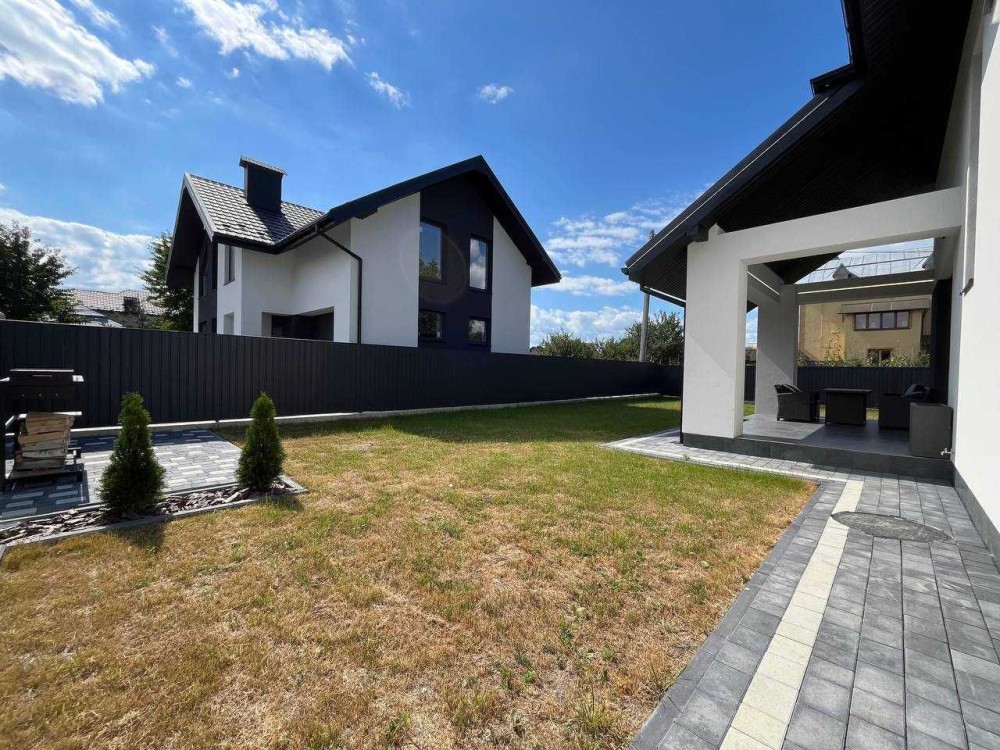 Просторий двір із зеленим газоном, огороджений стильним парканом, та облаштована парковка додають будинку практичності та шарму.