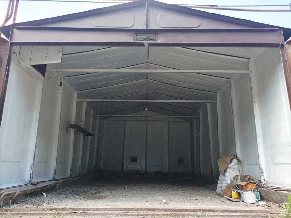 Металевий, підлога бетонна, утеплений керамзитом, є електрика. Великий погріб: 2 приміщення + прохід. Територія охороняється, вивозиться сміття, є естакада. Від власника. Торг.