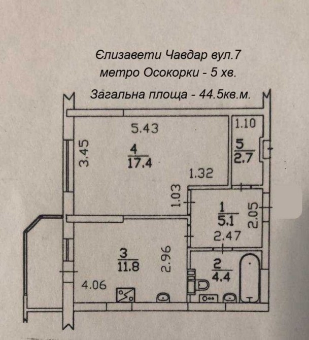 - суміщений санвузол - 4.4кв.м.,