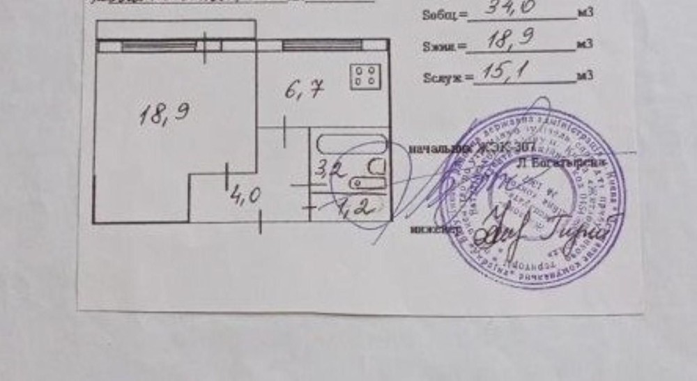 Площа квартири 34,86 м², Житлова площа 18,9 м², кухня 6,7 м².