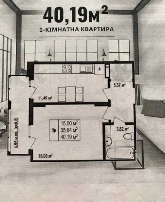 Площа: 40.19 / 28.76 / 11.45 м²