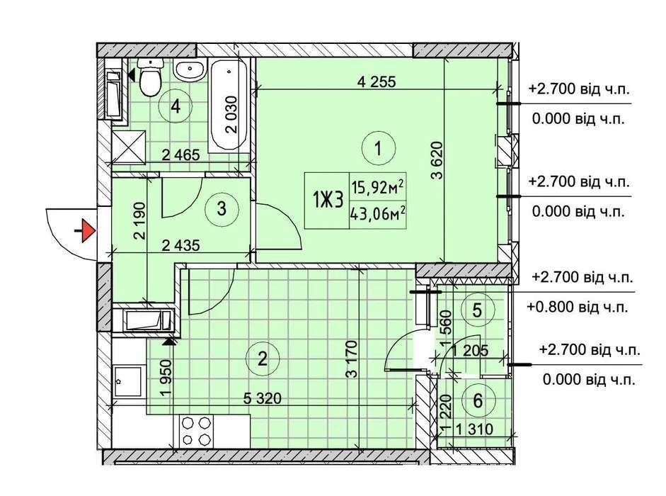 • Общая площадь 43.06 м2