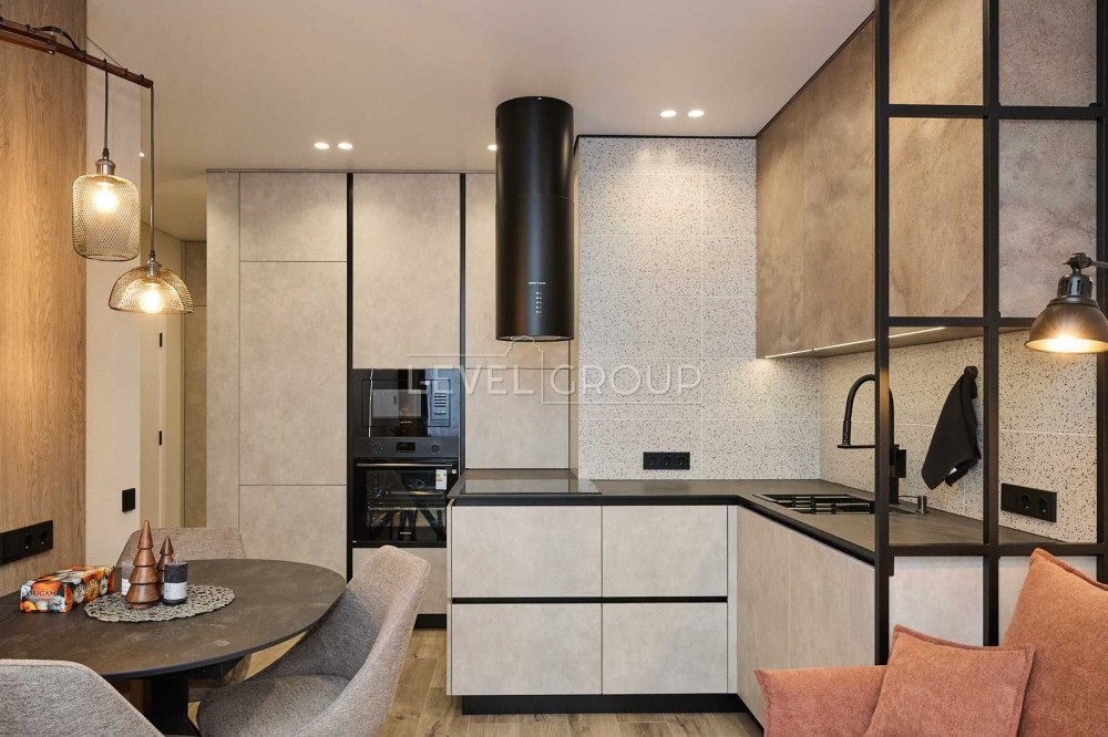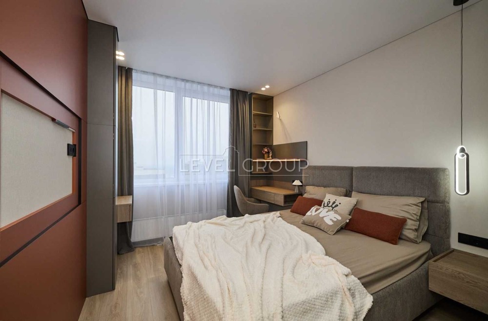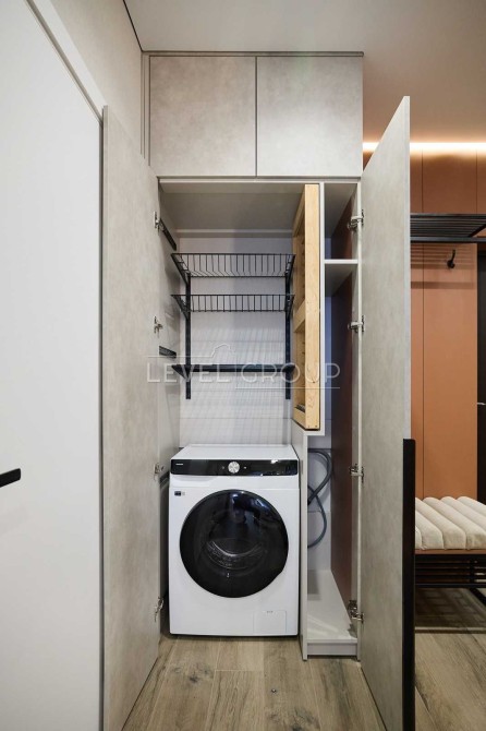 Планування передбачає кухню-вітальню, простору спальню з гардеробною, санвузол з душем, передпокій. В квартирі є все необхідне для комфортного життя. Техніка від провідних брендів: вбудований холодильник, морозильна камера та посудомийна машина, варильна поверхня, витяжка, бойлер, духова шафа, мікрохвильова піч та прально-сушильна машина від Samsung, встановлені виводи для кондиціонерів. Підігрів підлоги у передпокої та санвузлі. Квартира затишна та простора, багато місць для зберігання, чудовий панорамний вид з вікон.