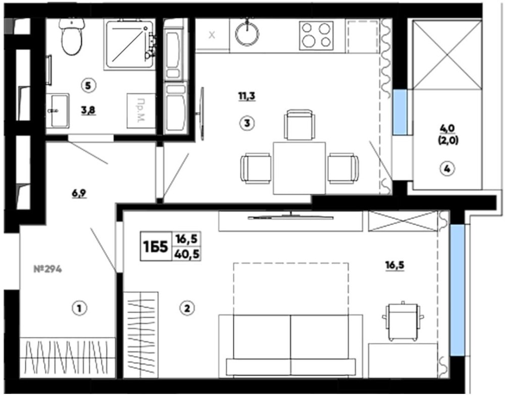 Площа: 40,5 м² (з можливістю збільшення до 44,5 м² за рахунок балкона)