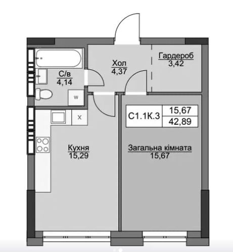 Загальна площа 42.89м2