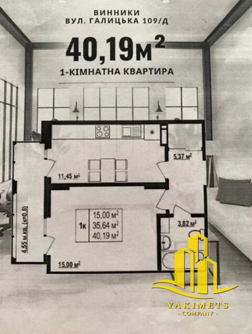 – кухня 11,45 м² з можливістю облаштування кухні-вітальні