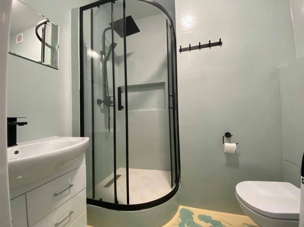 Тепла підлога в кімнаті, коридорі, ванній кімнаті, також у піддоні душової кабіни, яка виконана із мармурової крихти.