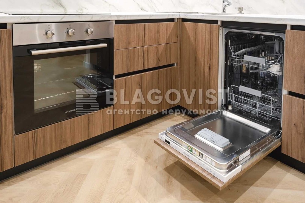 Обладнана сучасною побутовою технікою відомих брендів: кондиціонер, пральна машина, телевізор, вбудований холодильник, посудомийна машина, духова шафа, індукційна варильна поверхня, бойлер, домофон.