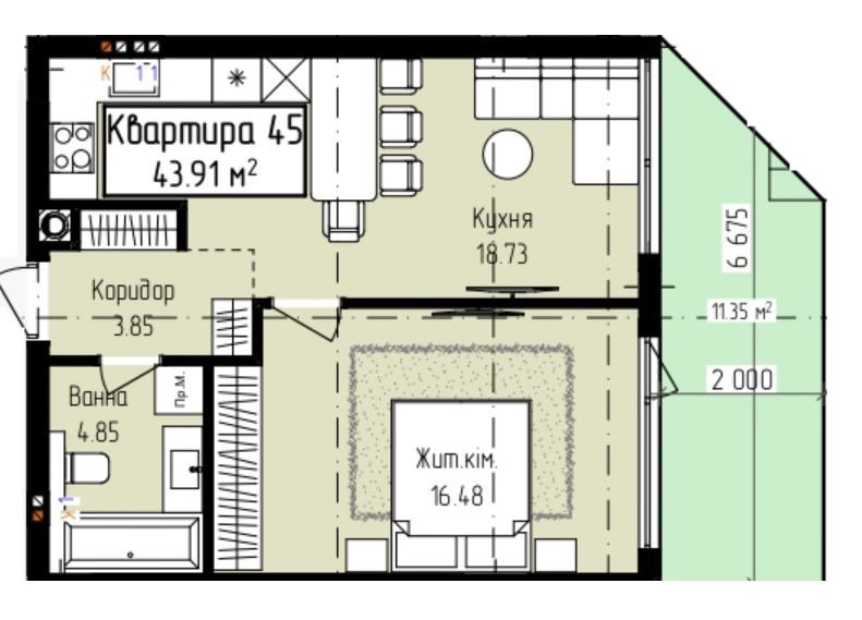 Дана квартира площею 43,91м2 знаходиться на 1 поверсі та має свою власну терасу 13,35м2 , плануванням квартири передбачено велику кухню-вітальню (18,73м2) з виходом на власний дворик, спальню кімнатну ( 16,48м2) та санвузол ( 4,85м2).