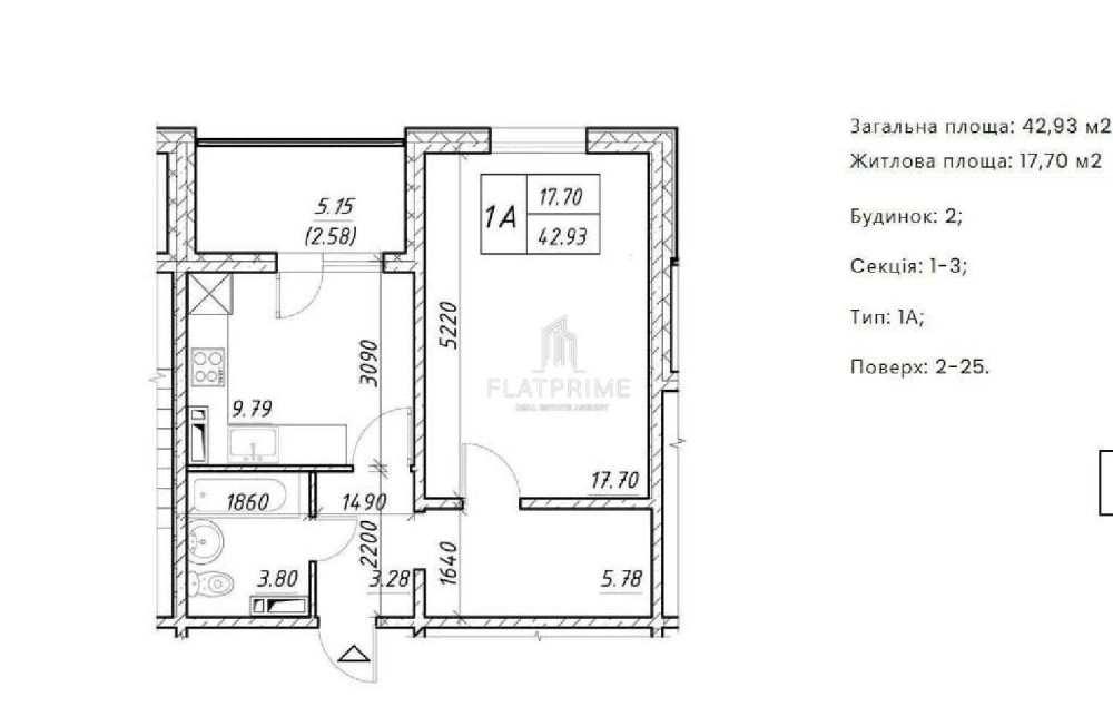 • Общая площадь 43 м2