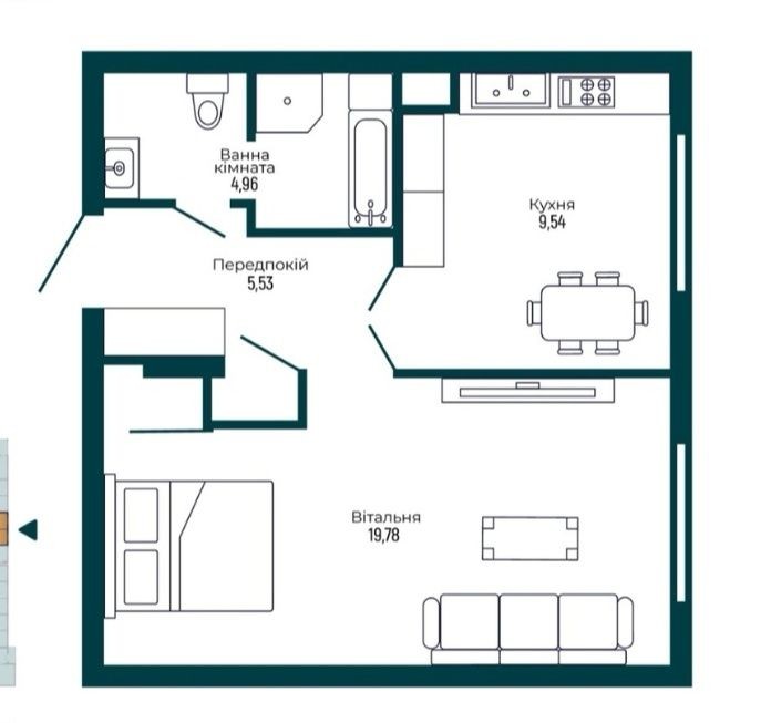 • Площадь кухни 9.54 м2