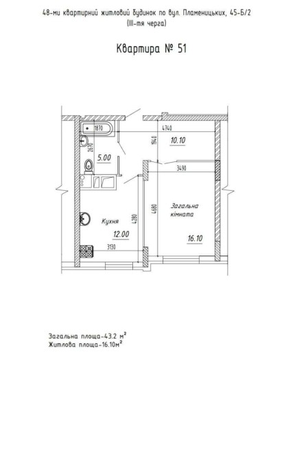 Загальна площа 43,2 м2;