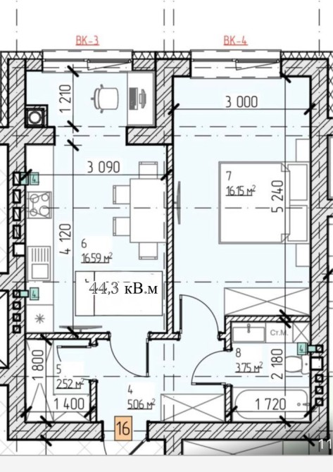 • Общая площадь 44.3 м2