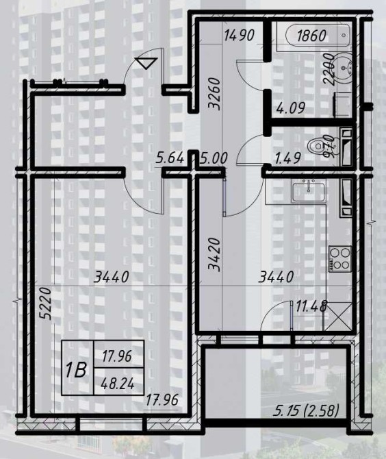 Площа: 48.24м²/17.96 м²/11.48м²