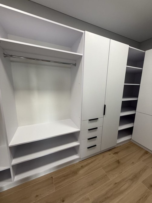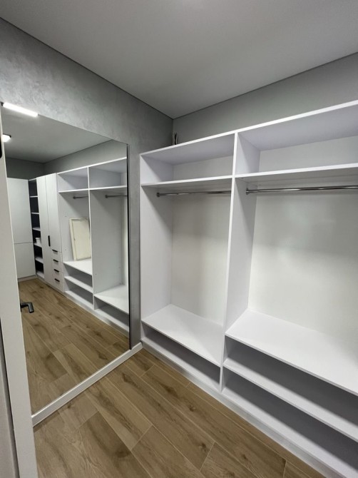 Гардеробна кімната облаштована меблями, великим дзеркалом і вмонтованою пральною машиною