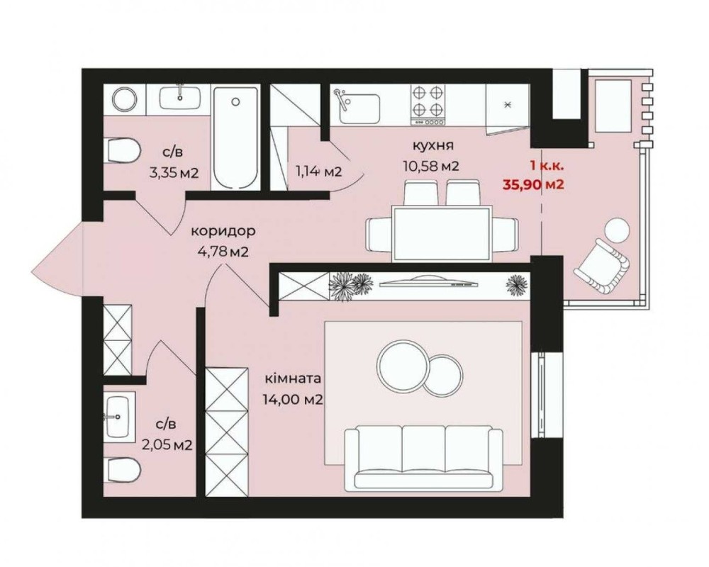 • Общая площадь 35.9 м2