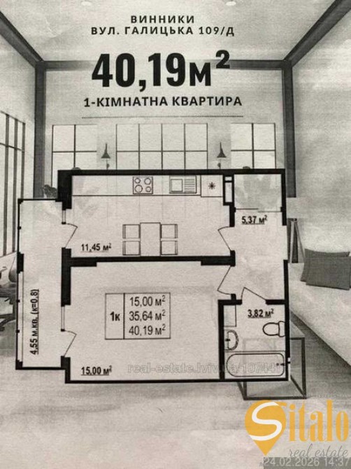 Загальна площа квартири 40,19 кв.м. Житлова площа 15 кв.м. Площа кухні 12 кв.м.