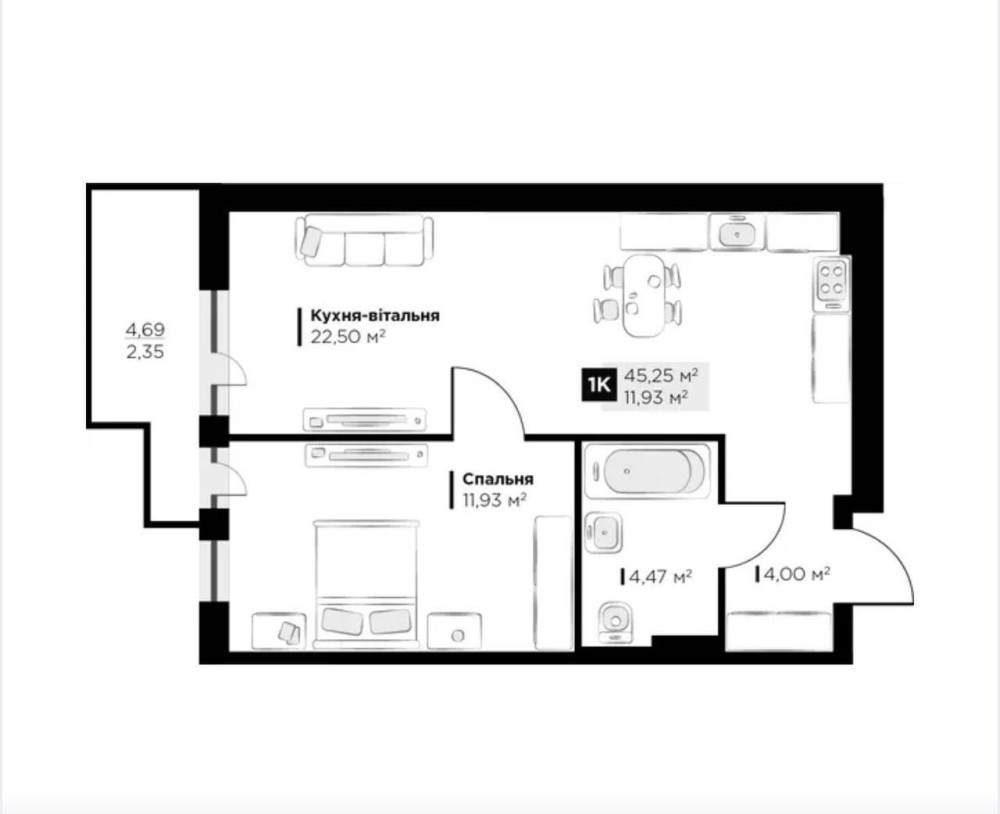 Площа — 45.25 м²