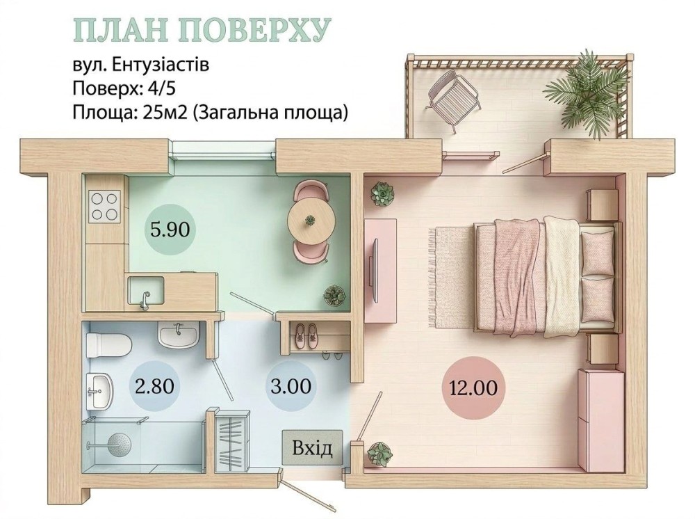 • Площа 25м2. Кімната 14м2