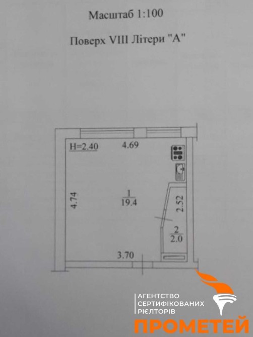 Квартира знаходиться на 8 поверсі, 9 поверхового будинку, загальною площею 21,4 кв.м, житловою 16 кв.м та кухнею 3,3 кв.м.