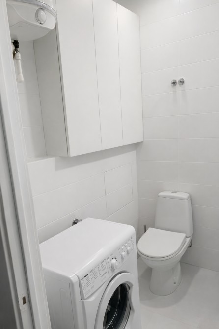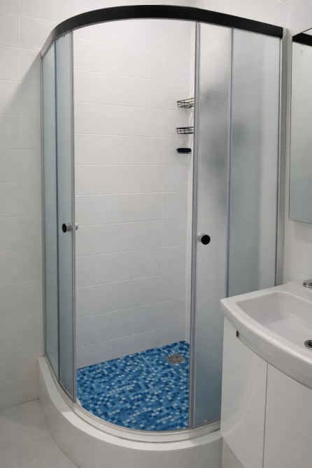 У ванній кімнаті встановлено душову кабіну, бойлер і пральну машину.