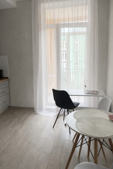 Окрема кухня з видом на внутрішній двір через вікна. Спальня з просторим двоспальним ліжком. Усе необхідне обладнання та меблі залишаються в помешканні.
