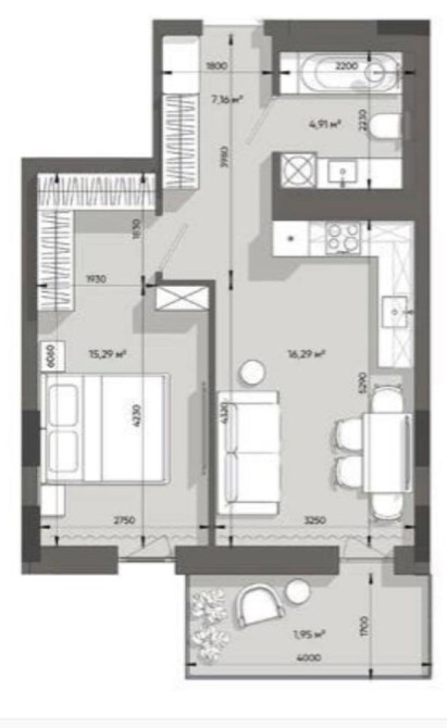 Планування : вхідна група ,санвузол 5м2; спальня ,місце під гардероб ,простора кухня -вітальня та відкритий балкон