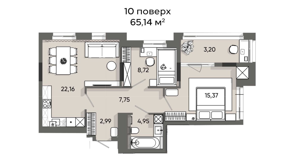 Планування: кухня - вітальня 22,16 м2, перша спальня 15,37 м2 з виходом на лоджію 3,2 м2, друга спальня 8,72 м2, ванна кімната 4,95 м2, коридор 7,75 м2, передпокій 2,99 м2.
