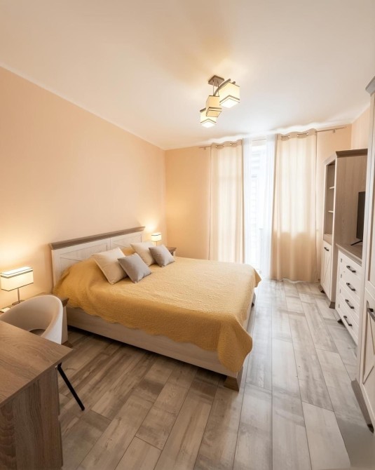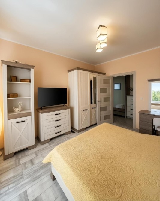 - В спальні всі необхідні меблі двоспальне ліжко, комод, шафа, туалетний столик з дзеркалом, телевізор.