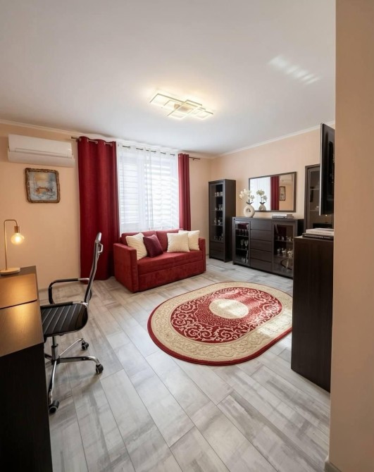 - У вітальні диван, телевізор, комод, робочий стіл.