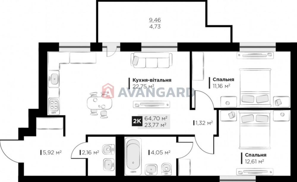 Загальна площа квартири — 64,7 м