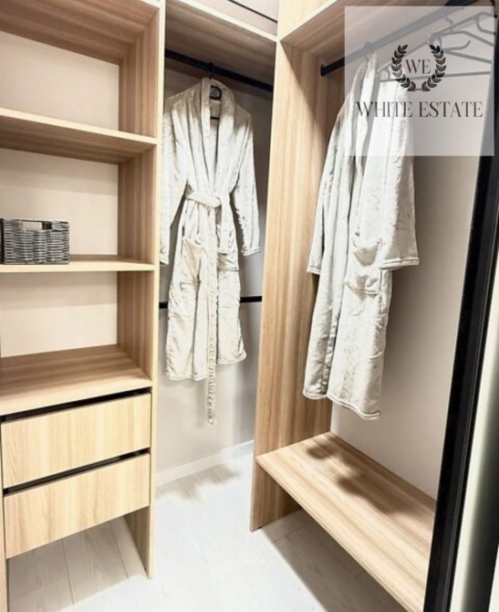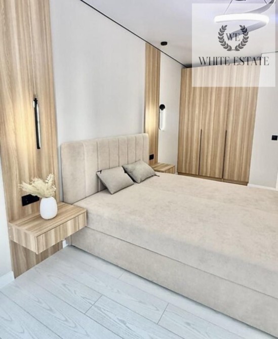 Одна спальня облаштована двох спальним ліжком, вмонтована шафа, тумби, стіл з стільцем. Друга кімната без меблів.