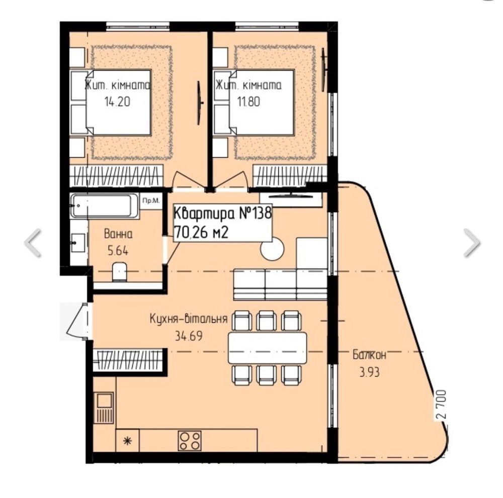 Площа кухні - 34,69м2