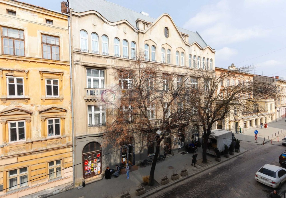 Два фасадні вікна виходять на Пекарську — ви бачите і відчуваєте ритм міста, а ще одне — у тихий зелений дворик, де можна відпочити від метушні.