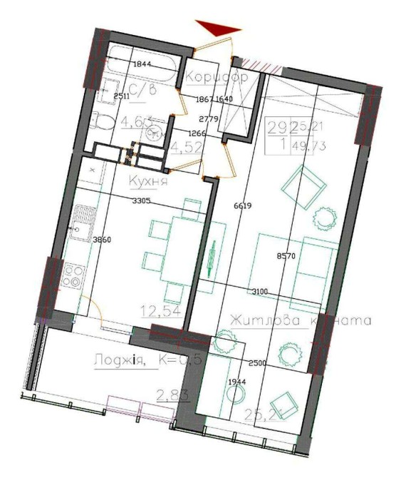 • Площадь кухни 12.54 м2