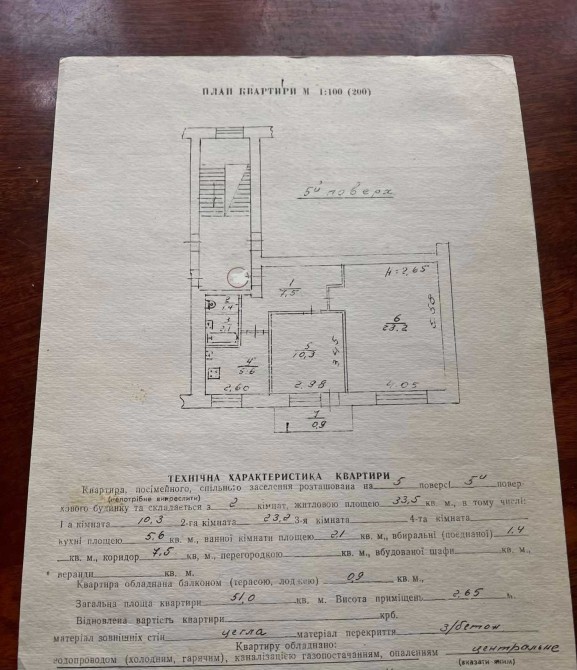 Загальна площа-51м2, житлова-33,5м2, кухня-5,6м2. Квартира знаходиться на 5-му поверсі 5-ти поверхового цегляного будинку. Відомчий будинок 60-х років.
