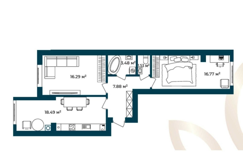 • Площадь кухни 18.49 м2