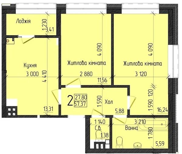 Площа квартири - 57,37м2.