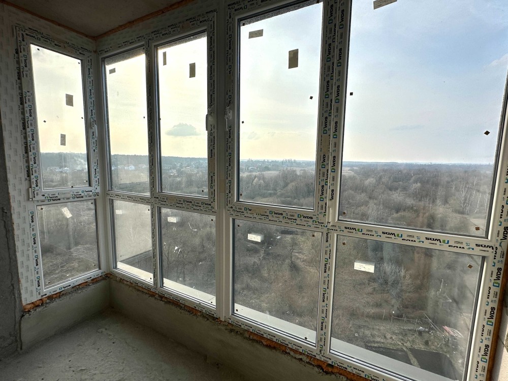 Чудове планування , простора кухня - вітальня з панорамним вікном .
