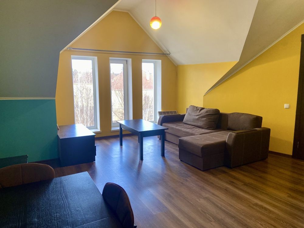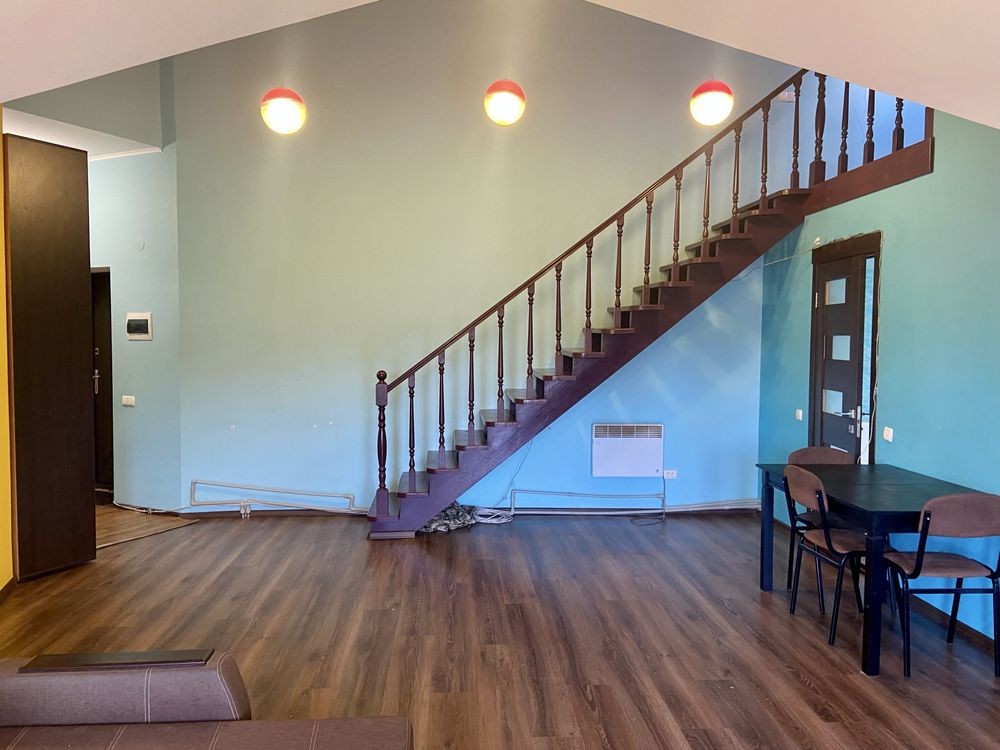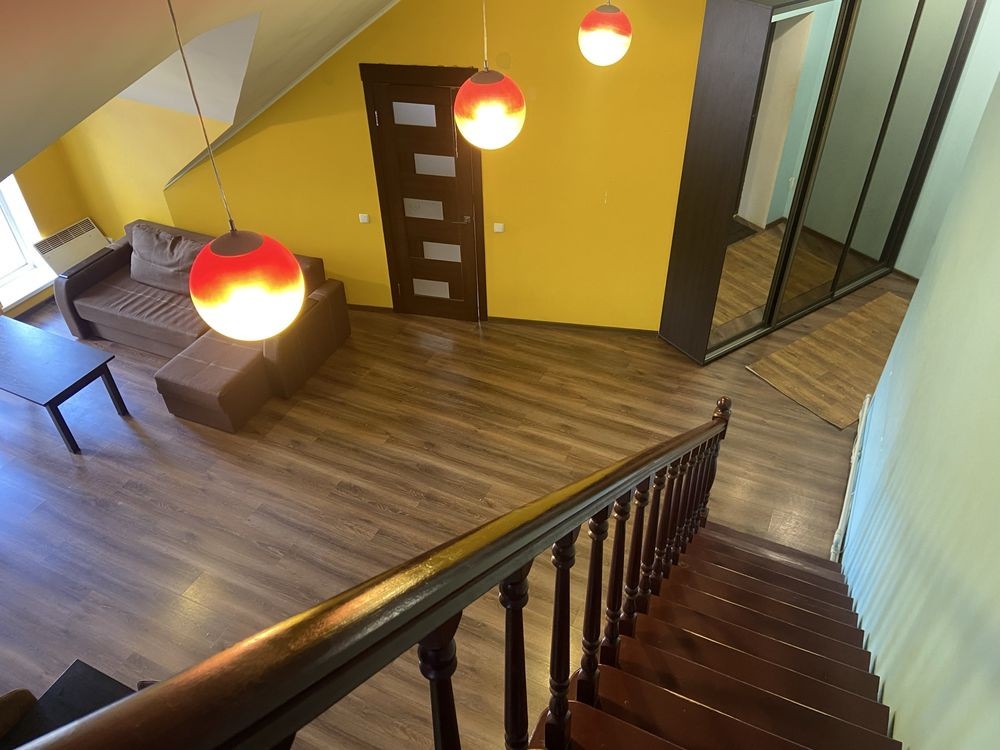 2 кімнатна 58 м2, велика гостьова 31 м2 та окрема спальня 9 м2, висока стеля, невелика кімната відкритого типу на другому поверсі. Квартира на електриці, всі комунікації централізовані. В комплексі є приватний дитячий садочок, магазин, школа- 7 хв ходьби, затишне, зелене містечко.