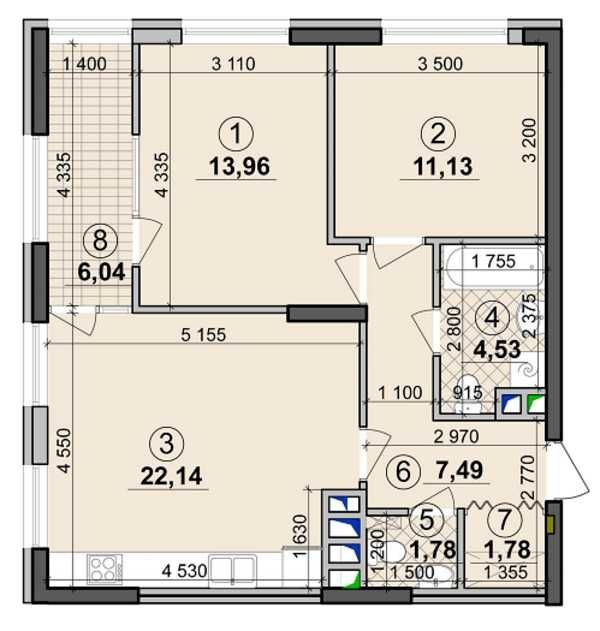 Загальна площа – 68,90 кв.м2, велика кухня студія, дві роздільні кімнати, два санузли, балкон 6 кв.м2, вихід з кухні та кімнати