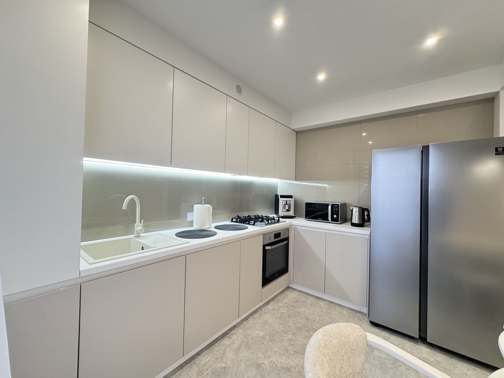 • Оснащена сучасною технікою: холодильник, посудомийна, пральна й сушильна машини, духова шафа, варильна поверхня, кондиціонер, кавомашина