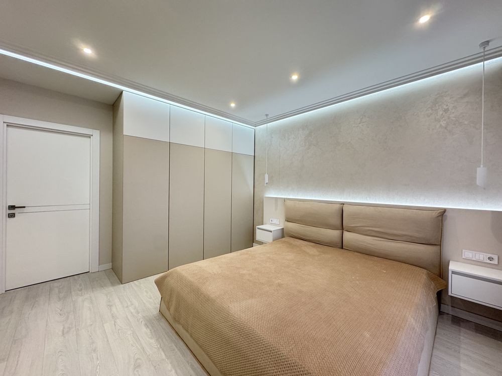 Житло після якісного дизайнерського ремонту, виконаного з увагою до деталей. Декоративне оздоблення стін, підвісні стелі з підсвіткою, поєднання точкових і висячих світильників створюють затишну атмосферу.