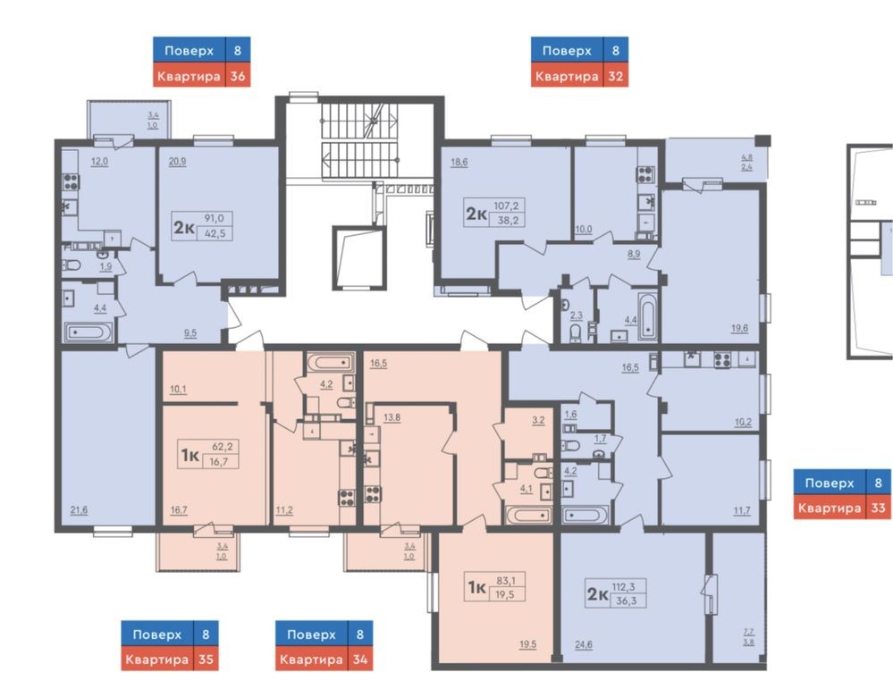 7м2, 8/8 поверх, вільне плануввання, дворівнева, всі комунікації заведено в квартиру.