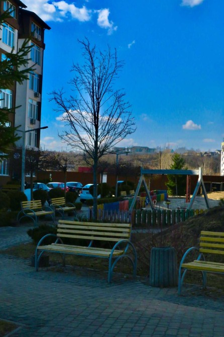 Двір облаштований дитячими майданчиками, зоною відпочинку, гостьовими паркінгами, встановлені шлагбауми.