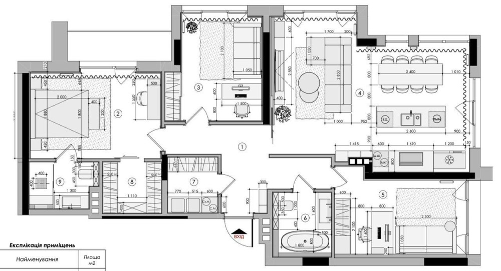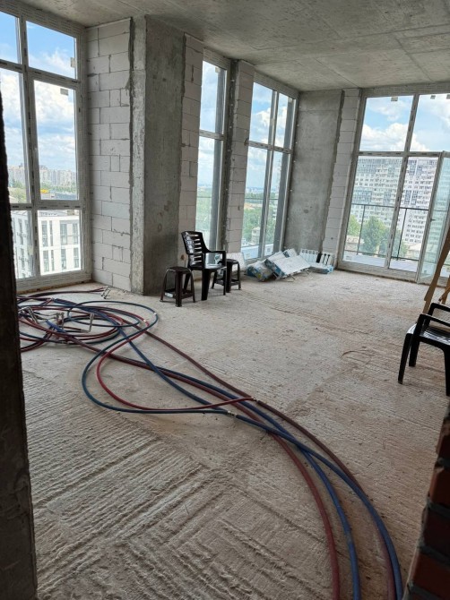 Квартира знаходиться на 14 поверсі 14-ти поверхового будинку, загальною площею 131,9 м2, кількість кімнат: три – 46.1м2, кухня-вітальня 37.3м2, стеля – 3,3м, два санвузла, дві гардеробні кімнати. Житловий комплекс комфорт-класу.